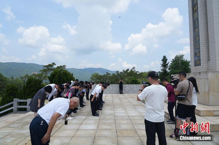 采访调研团成员在松毛岭战斗烈士纪念碑前鞠躬致敬