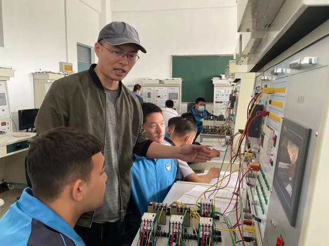 新疆阜康市职业中等专业学校教师在指导团队中的学生开展实践训练活动。