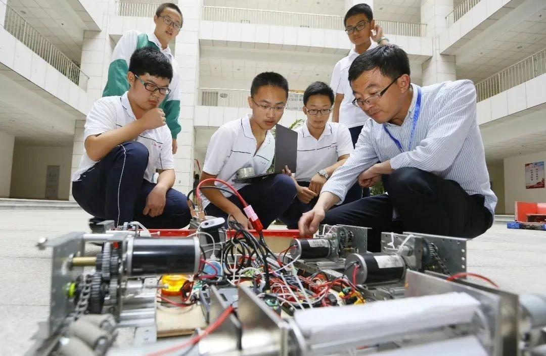 泉州市第五中学科创俱乐部师生正在调试简易机器人基座。