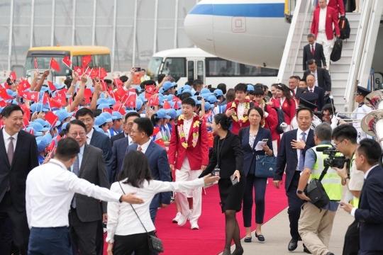 29日中午,国家体育总局局长高志丹和国家体育总局副局长周进强率领奥运健儿代表团抵港,香港特区政府在香港国际机场举行欢迎仪式,特区政府政务司司长陈国基、中国香港体育协会暨奥林匹克委员会会长霍震霆及其他嘉宾在场迎接。