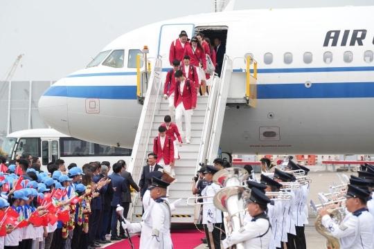 马龙、全红婵、潘展乐等65名运动员和8名教练员依次走下舷梯,与现场迎接的嘉宾以及香港青少年代表一一挥手致意,青少年代表为运动员戴上花环。