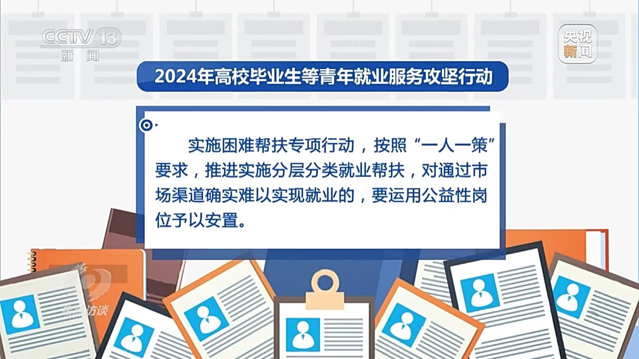 眼下2024届高校毕业生已经基本离校,但仍有部分毕业生还没有落实就业岗位。为此,人力资源和社会保障部启动了2024年高校毕业生等青年就业服务攻坚行动,行动于今年7月至12月,对2024届离校未就业高校毕业生和登记失业青年集中提供招聘对接、困难帮扶、能力提升和权益维护等不断线就业服务,力争让有就业意愿的未就业毕业生和登记失业青年年底前都能实现就业,或参加到就业准备活动中。