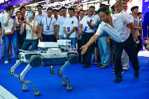 8月28日,参会人员在2024中国国际大数据产业博览会上与机器狗互动。新华社记者 杨文斌 摄