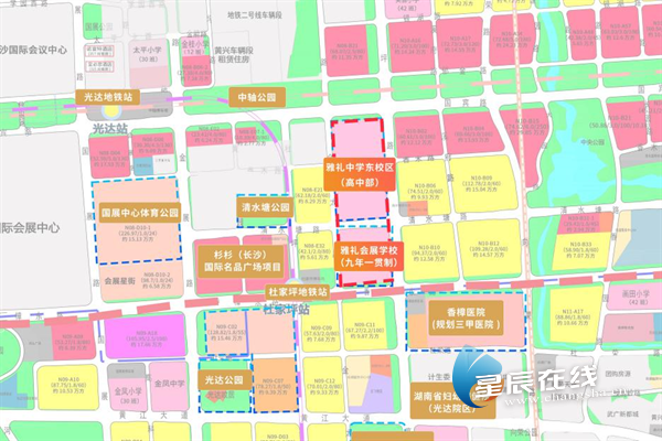 长沙国际会展新城教育雅礼会展学校(小学+初中)占地面积约87亩,办学规模为54个班,为公办九年一贯制义务教育学校,由长沙市雅礼中学进行委托管理办学,按照片区内“相对就近”原则及当年招生政策入读。该项目现已立项,正在进行前期设计工作,预计2025年动工,2026年秋季开学。