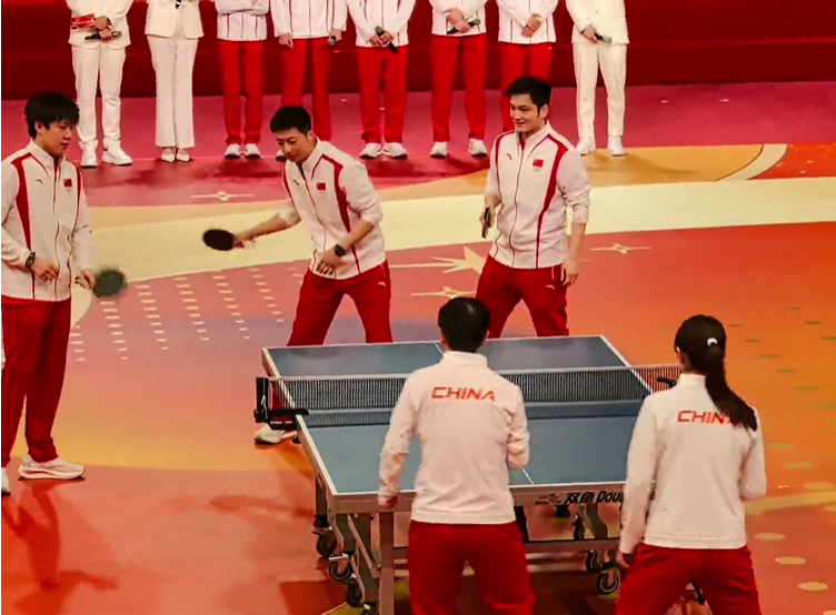 汇演一开幕,乒乓球队六位冠军选手共聚一“台”的对抗赛,便给现场观众带来别样惊喜。