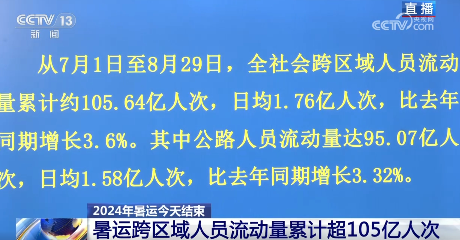 央视网消息:从7月1日到8月31日,为期62天的暑运31日结束。交通运输部发布数据,暑运期间全社会跨区域人员流动量日均达1.76亿人次。今年暑运全国公路和水路出行有什么特点?我们马上来连线正在交通运输部综合调度指挥中心的总台央视记者唐颖。