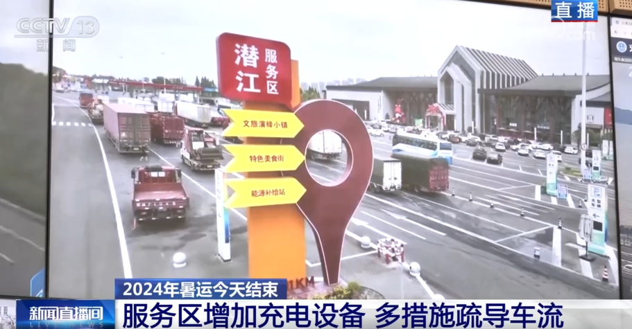 接下来我们看到的是上海绕城高速,整个暑运期间,可以说长三角区域的车流量都是比较大的。除此之外,就是珠三角地区,此刻我们看到的广东水官高速,深圳到东莞,8月31日是周末,此刻路上通行的车流量平稳有序。根据交通运输部路网中心的大数据分析,暑运期间最繁忙的服务区几乎都位于长三角地区,排名第一的就是京沪高速的无锡梅村服务区,我们此刻看到整个服务区车流量已经较上午有了明显的增长。今年暑运期间,梅村服务区日均车流量达2.4万辆,其中新能源车占比超六成,服务区在已有8个双枪充电桩设备的基础上,根据车流量随时增加移动充电设备。