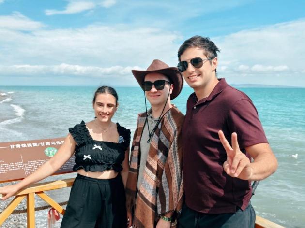 墨西哥网红博主麦克斯(左)和诺莉娅打卡清清黄河 摄影 赵博