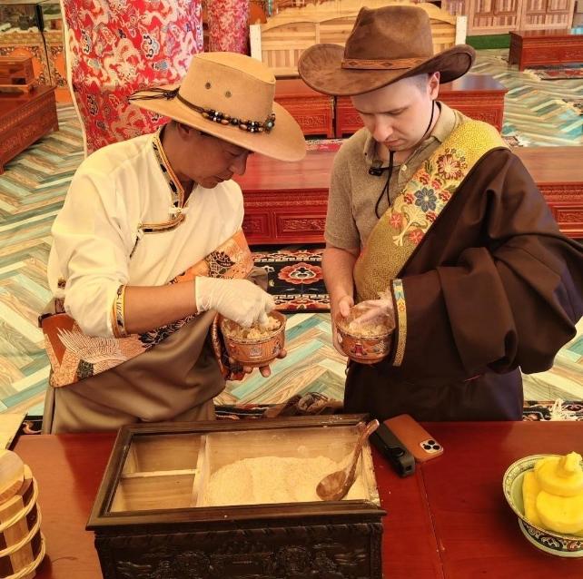 英国网红博主鹿可(右)学习制作糌粑 摄影 赵博