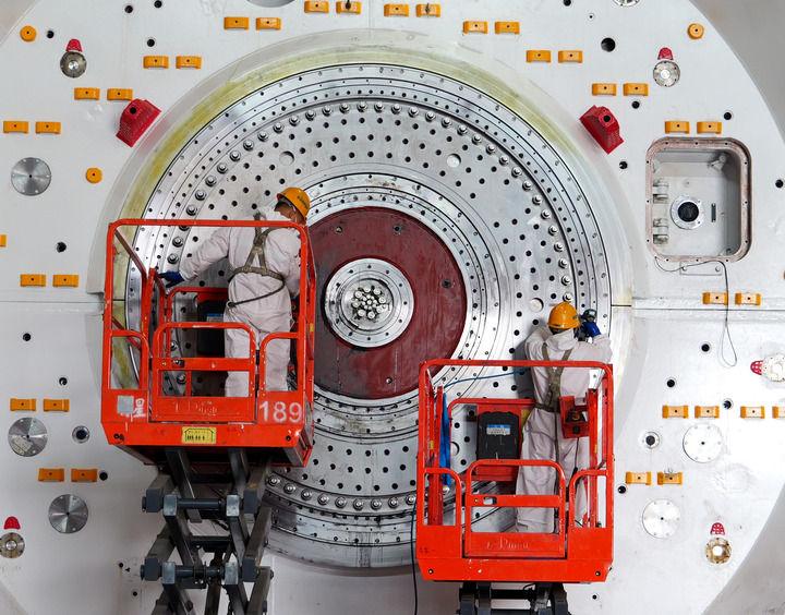 3月15日,工人在位于河南郑州的中铁装备集团车间内进行盾构机主驱动清理作业。新华社记者李嘉南摄