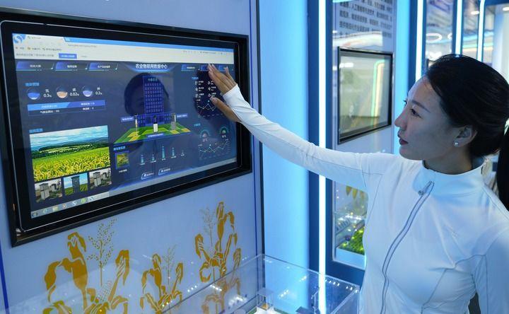 2024年5月16日,工作人员在河南省中原农谷高标准农田查看农业物联网数据。新华社记者李嘉南摄