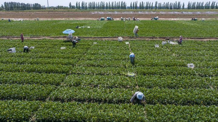 在宁夏青铜峡市瞿靖镇毛桥村蔬菜基地,来自贵州的苗族务工人员杨文高(右)在采收间隙和女儿聊天(2024年8月23日摄)。新华社记者 杨植森 摄