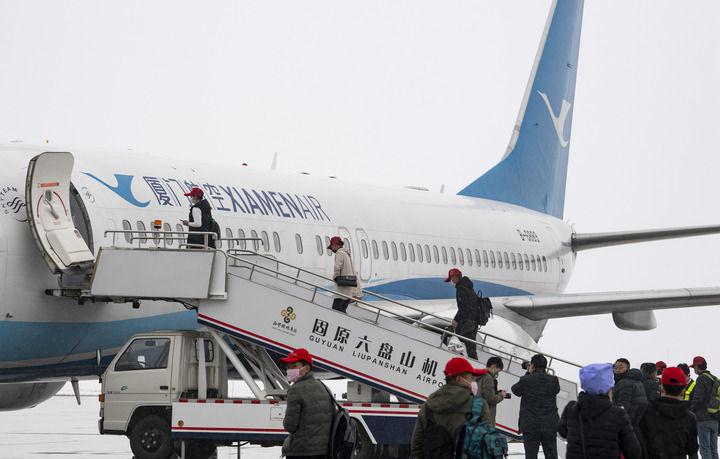在宁夏固原六盘山机场,固原市原州区、西吉县的务工人员乘包机前往福建(2020年2月27日摄)。新华社记者 冯开华 摄