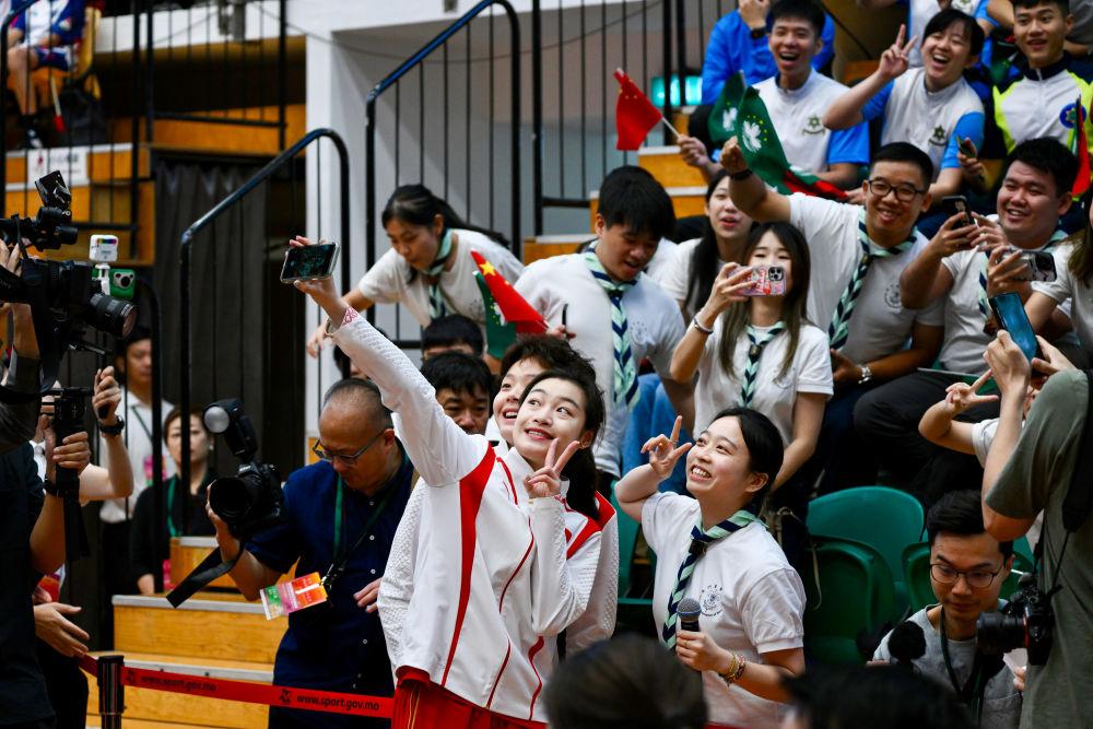 除座谈问答外,中国艺术体操队的“金花”们还在现场进行了技艺示范,并与学生进行艺术体操教学互动;巴黎奥运会乒乓球混双冠军王楚钦、孙颖莎,男单冠军樊振东,女单冠军陈梦也与澳门乒乓球运动员进行了混编对战。
