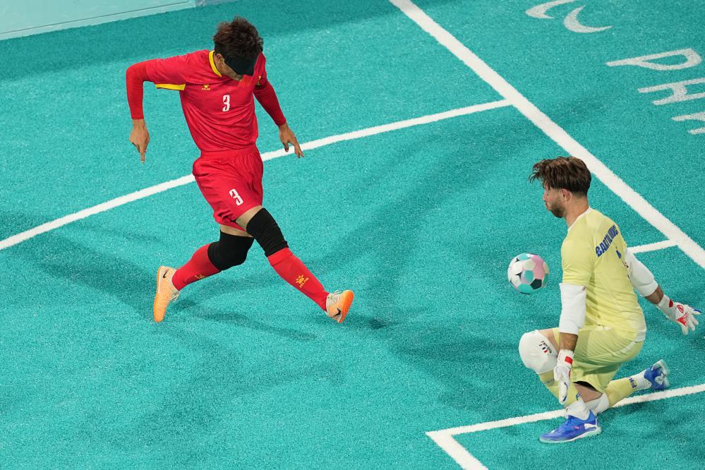 2008年9月15日,中国队球员俞裕锬(左二)带球进攻。当日,在北京2008年残奥会盲人足球小组赛中,中国队以1比1战平巴西队。新华社记者 郭勇 摄