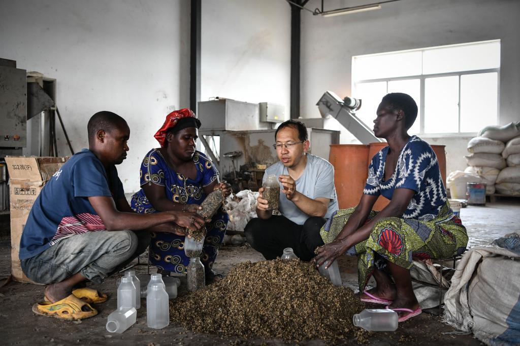 8月13日,在卢旺达南方省胡耶区的中国援卢农业技术示范中心,菌草专家陈晓斌(右二)与当地农民一起制作菌种培养料。