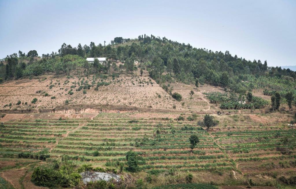 这是8月15日在卢旺达南方省拍摄的一处使用等高线种植巨菌草活篱笆和梯田套种农作物模式的水土保持田。