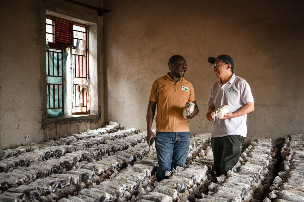 8月14日,在卢旺达南方省尼安萨区的一家食用菌培育工坊,菌草专家陈晓斌与工坊主人卡纳尼·埃纳尼交流。