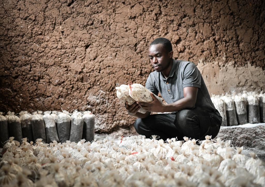 8月14日,在卢旺达南方省穆汉加区,尼扬博·奥贝德在食用菌培育工坊内检查菌袋。曾两次赴中国进行菌草技术培训的尼扬博·奥贝德在南方省和东方省各拥有一家工坊。