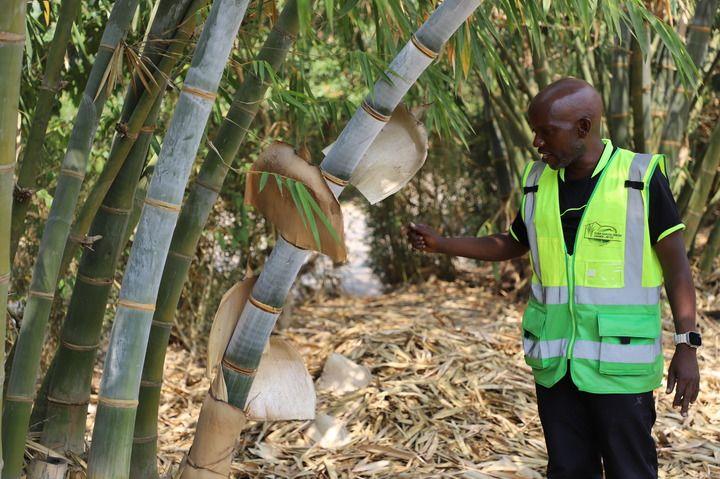 2024年8月5日,在乌干达西部姆巴拉拉市的竹子种植园,阿比·史蒂夫·图西梅在料理竹子。新华社发(罗纳德·塞坎迪 摄)