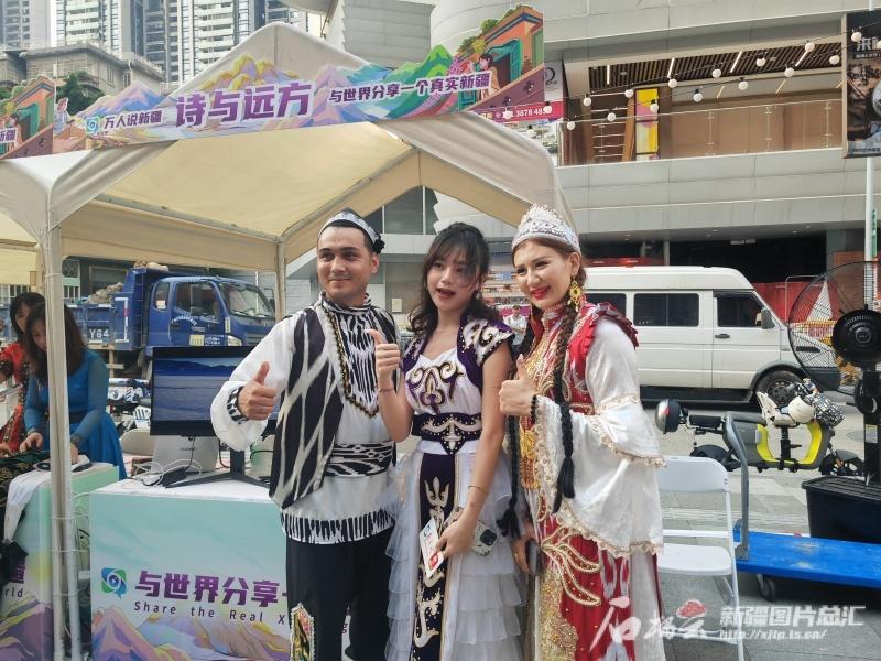 9月2日,“万人说新疆”走进广东分享会之新疆特色文化主题“大巴扎”在广州市越秀区289艺术创意园区北广场举行。广州市民陈婕(中)穿着新疆民族服饰与舞蹈演员合影留念。石榴云/新疆日报记者 甘兴华摄