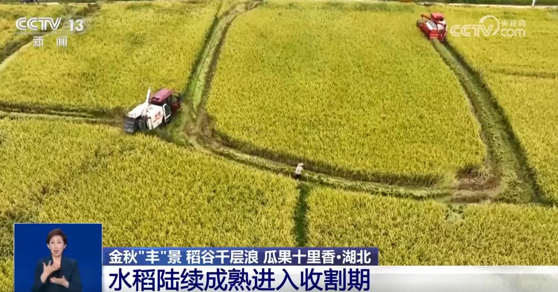 眼下,湖北孝感、宜城等地的水稻陆续成熟。在孝感市孝昌县的稻田里,收割机开足马力,村民们忙着装袋、装车。今年,孝昌县水稻种植面积40多万亩,预计9月底全部收割完毕。