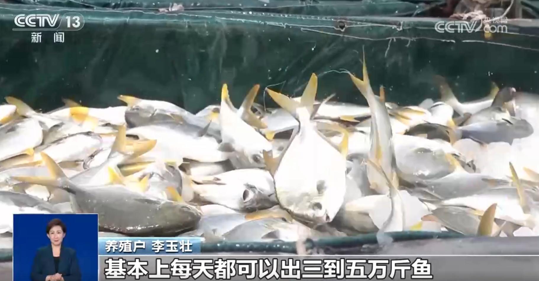 在防城港白龙珍珠湾,海面上分布着大大小小的圆形围栏,这些围栏下面就是标准化养殖金鲳鱼的深海抗风浪网箱。捕捞时,渔业工人们将网箱中的渔网收紧,成群的金鲳鱼便浮出水面,工人们再用网兜将金鲳鱼转移到运输船上。