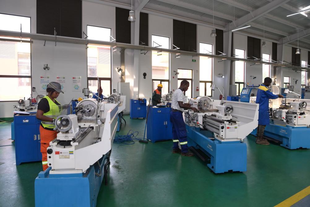 2023年1月10日,在加蓬首都利伯维尔的恩考克经济特区,恩考克国际职业教育和培训中心的学生进行车削加工操作训练。新华社记者韩旭摄