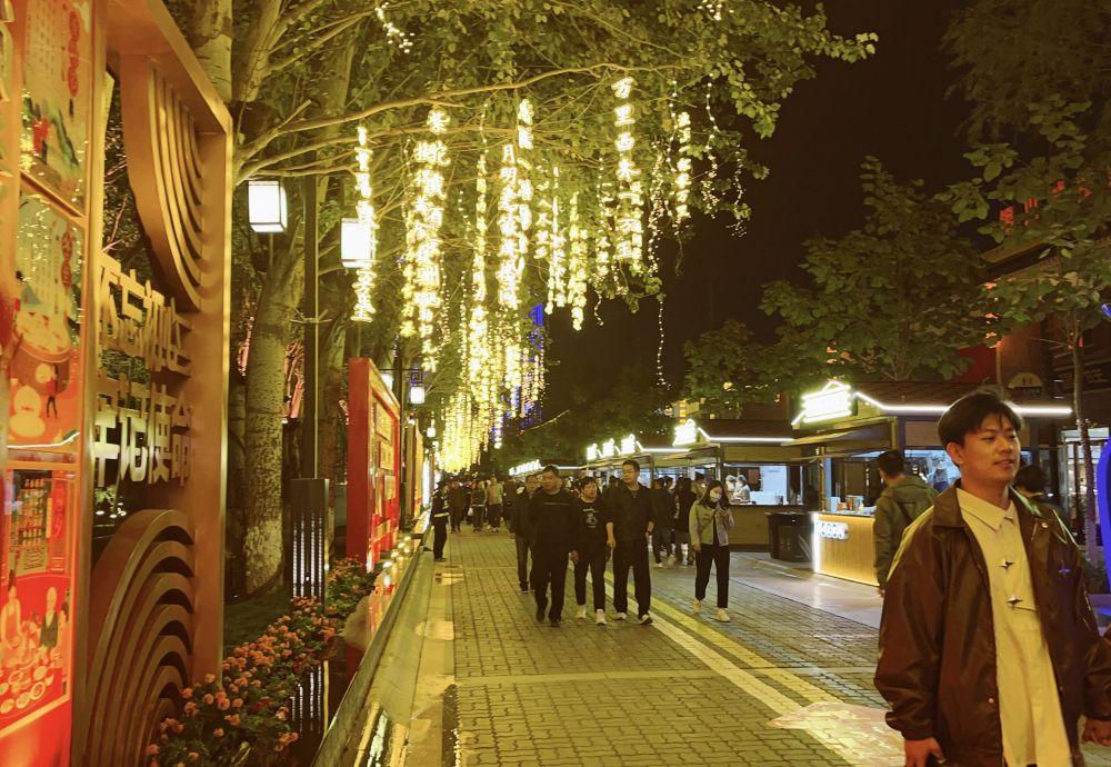 夜幕下的银川文化城“凤凰幻城”,市民、游客可以一边逛街一边欣赏诗词。新华社记者任玮 摄