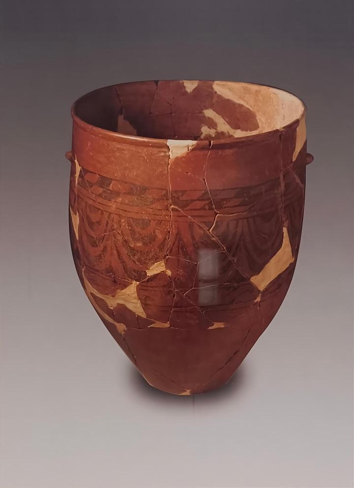 曾在赤峰博物馆展出的红山文化出土陶器中,还有一件融合了三种文化元素的陶罐,这就是20世纪70年代在赤峰市阿鲁科尔沁旗红山文化遗址中发掘出土的大型细泥红陶彩绘平底筒形罐。它如同一部无声的史诗,告诉世人在五千多年前的红山,曾经上演过怎样的文明交融。
