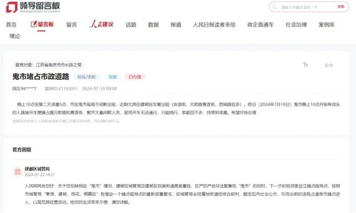 7月18日,有网民在人民网“领导留言板”反映,南京市区“鬼市”每周不间断出现。4天后,建邺区城管局回复网友表示,探索设立摊点疏导点。