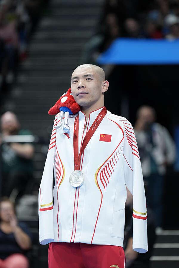 8月30日,郭金城在领奖台上。他以1分8秒22的成绩获得巴黎残奥会男子100米自由泳S5级决赛亚军。新华社记者 张豪夫 摄