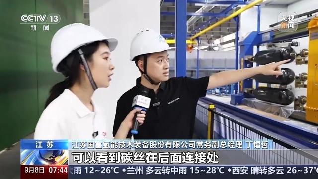 江苏国富氢能技术装备股份有限公司常务副总经理 丁镭哲:这里是我们的核心工艺之一,碳纤维缠绕。你可以看到碳丝在后面连接处,就像一个织布机一样,一层一层往上织。碳纤维主要是用来承压的。