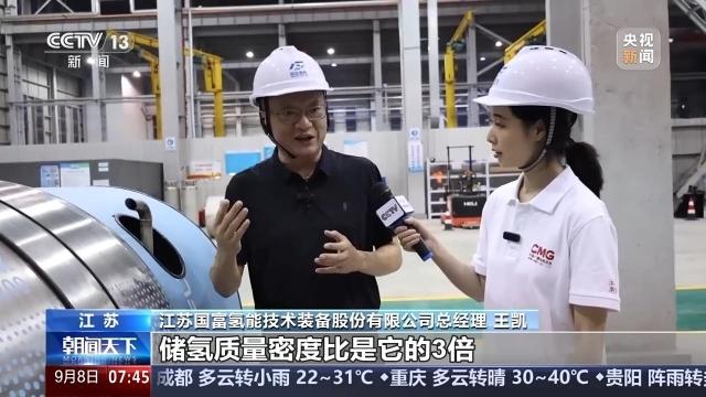 江苏国富氢能技术装备股份有限公司总经理 王凯:这是我们公司研发的液氢储氢瓶,比常规的三型瓶、35兆帕等级的,储氢质量密度比是它的3倍,对车辆的续航里程是非常有帮助的。
