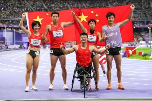 9月6日,中国队选手文晓燕、王浩、胡洋、周国华与领跑员贾登璞(从左至右)在比赛后庆祝。新华社记者 张铖 摄
