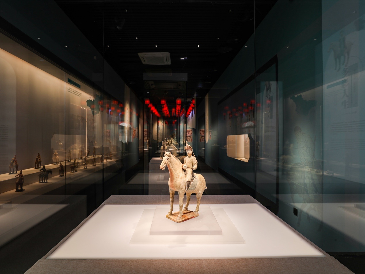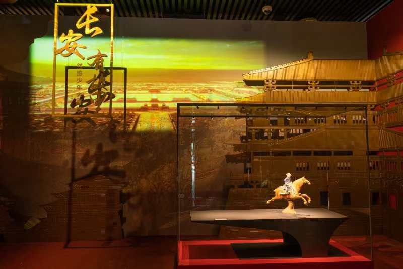 目前,西安博物院博物馆内展出文物有2000多件。与“带猞猁狩猎女俑”同样在馆的还有大名鼎鼎的镇馆之宝——唐代三彩腾空马。西安博物院陈列展览部部长朱歌敏介绍,去年推出的“长安有故里——丝路少年大唐行”展览,以镇馆之宝马背上的蓝衣少年为原型,通过少年在大唐长安游历的所见、所闻、所感,展现了“大唐金市”“百戏杂技”“狩猎出游”等典型场景,勾勒出唐代多姿多彩的世俗生活百态。