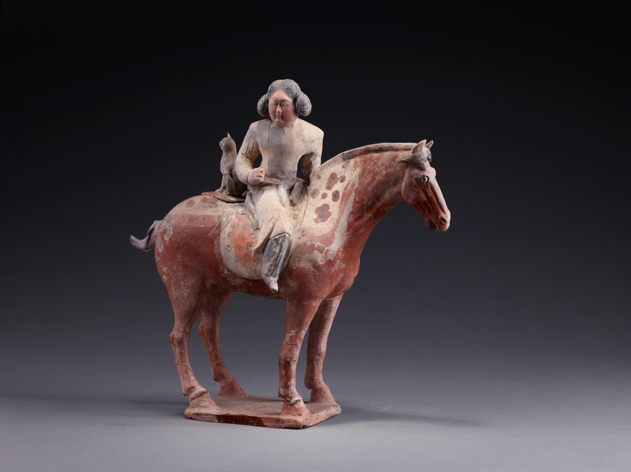 这是一位带着“喵星人”一起打猎的飒爽英姿的小姐姐。她来自唐代,头上梳着可爱的双尾髻,粉面朱唇,细眉黑目,身穿白色圆领窄袖缺袴袍,足蹬黑色长靴、胯下枣红马;她的身体微向右转,右手紧握成拳,左手前伸仿佛在控制缰绳,神情自若。最吸引人的是,她身后蹲伏着一只小巧可爱的动物——猞猁,猞猁是一种小型猫科猛兽,在唐代通常经过驯养,可以成为打猎的“最佳拍档”。这“一人一马一猞猁”栩栩如生,灵动跳脱。纵马飞驰而来的她,是怎样的契机才得以呈现在世人面前?又折射出唐代怎样的社会风貌呢?