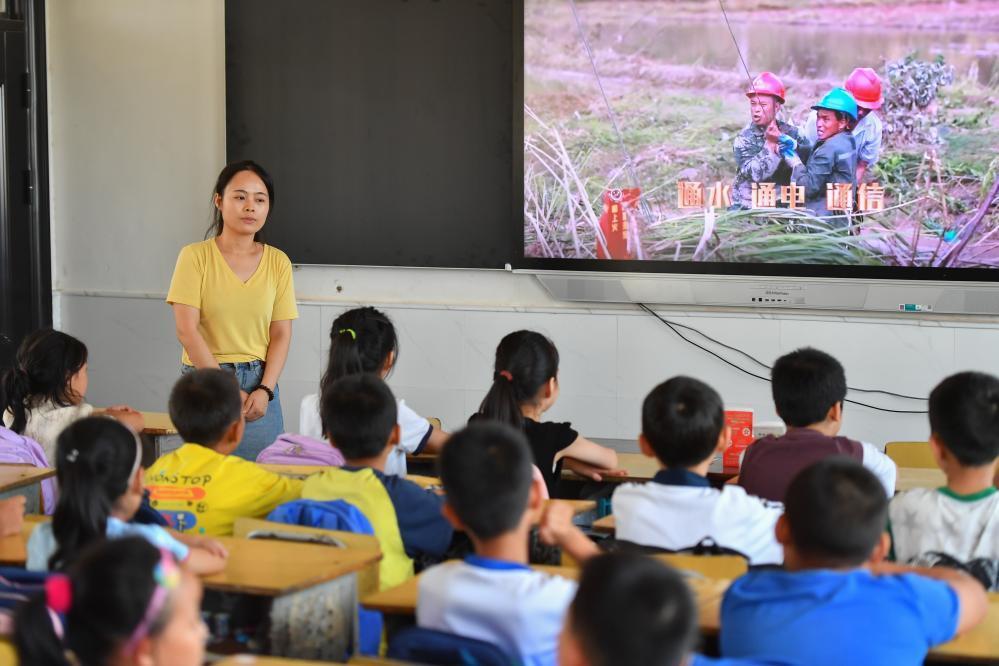 △今年夏天,湖南华容县等地遭受洪涝灾害。9月,华容县一所学校,老师通过讲述防灾救灾故事,引导孩子们知情、共情,汲取成长的力量。