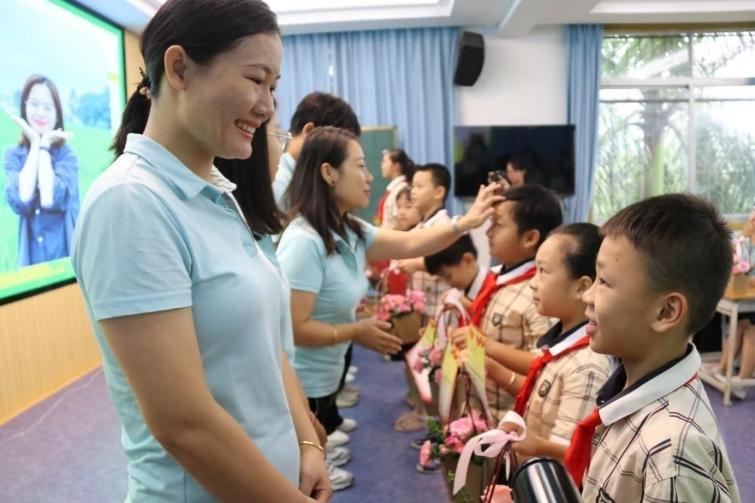 △2023年教师节前,广西南宁一所学校,学生向老师献上鲜花、贺卡。