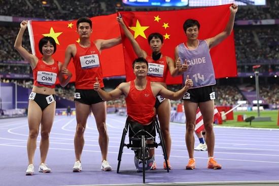在巴黎残奥会田径项目4×100米混合接力决赛中,由周国华、王浩、文晓燕和胡洋组成的中国队以45秒07的成绩夺冠,并打破该项目世界纪录。视觉中国供图