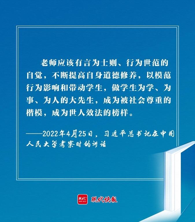 2022年4月25日,习近平总书记在中国人民大学考察时强调,“老师应该有言为士则、行为世范的自觉,不断提高自身道德修养,以模范行为影响和带动学生,做学生为学、为事、为人的大先生,成为被社会尊重的楷模,成为世人效法的榜样。”