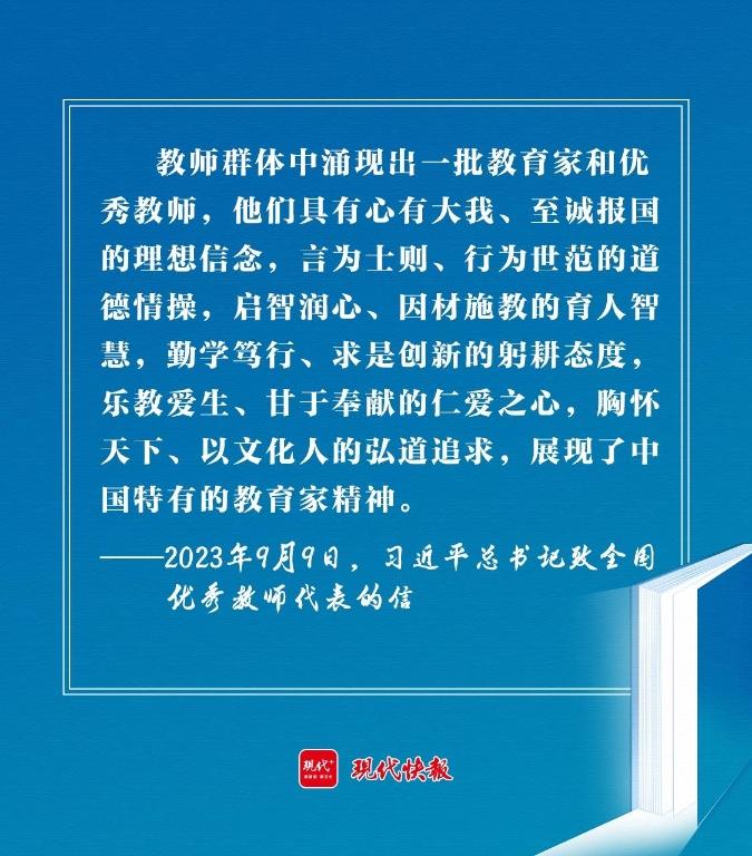 2023年9月9日,习近平总书记在致全国优秀教师代表的信中强调:“新征程上,希望你们和全国广大教师以教育家为榜样,大力弘扬教育家精神,牢记为党育人、为国育才的初心使命,树立‘躬耕教坛、强国有我’的志向和抱负,自信自强、踔厉奋发,为强国建设、民族复兴伟业作出新的更大贡献。”