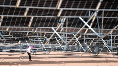 在甘肃省武威市凉州区九墩滩光伏治沙示范园区,工人在光伏板下作业(2023 年 5 月 19 日摄) 陈斌 摄 / 本刊