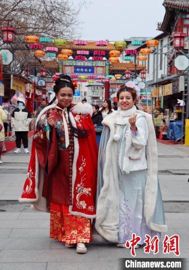 2024年春节,齐琪格和朋友穿汉服游览天津北塘古镇。(天津大学供图)