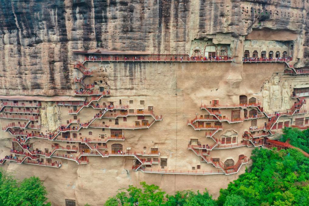 这是近日拍摄的甘肃麦积山石窟局部景象(无人机照片)。新华社记者 郎兵兵 摄