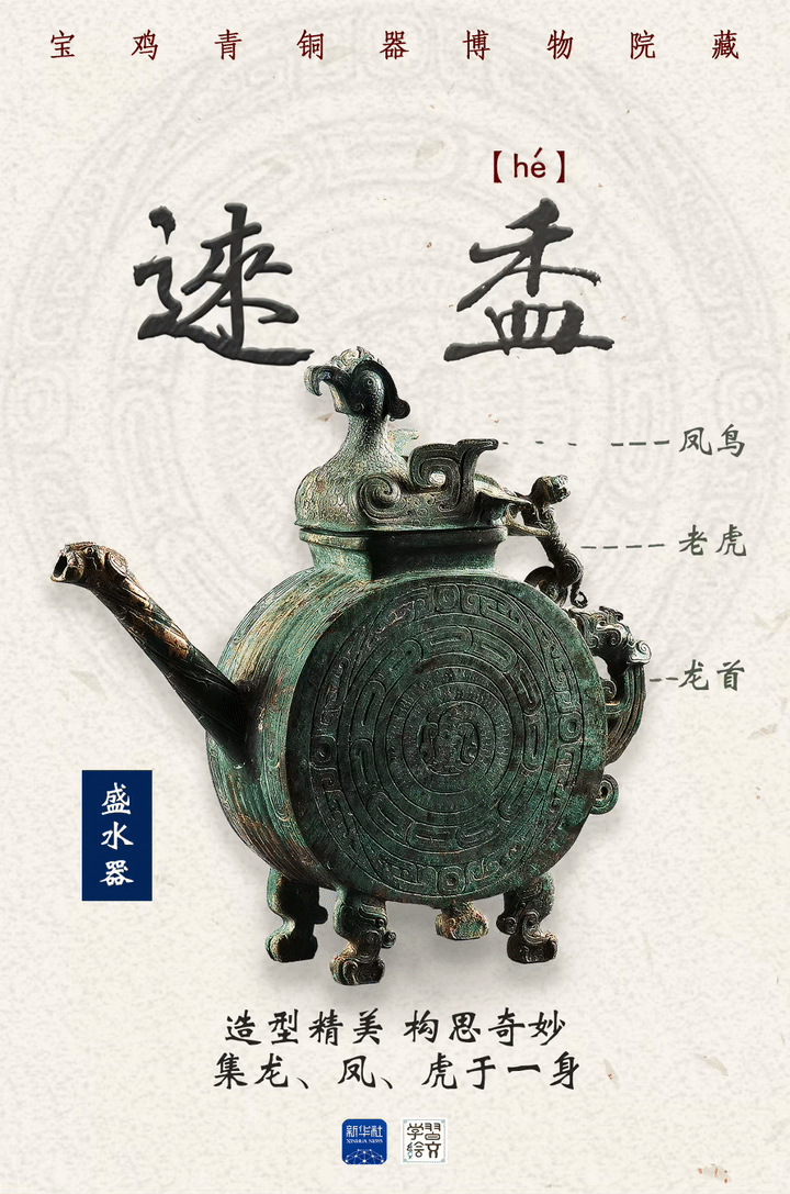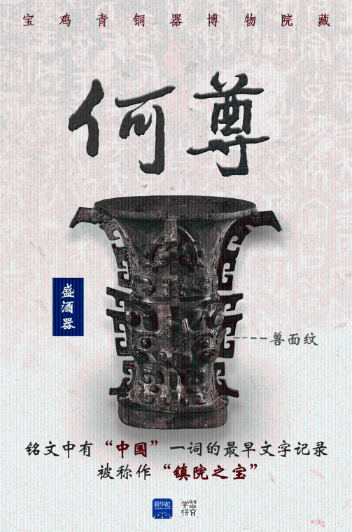 何尊,是宝鸡青铜器博物院“镇院之宝”,上圆下方,体现了古人“天圆地方”的宇宙观。腹部装饰有兽面纹,粗大卷曲的兽角翘出器外,颇有腾跃欲食的动感,是西周早期一件不可多得的青铜酒器。