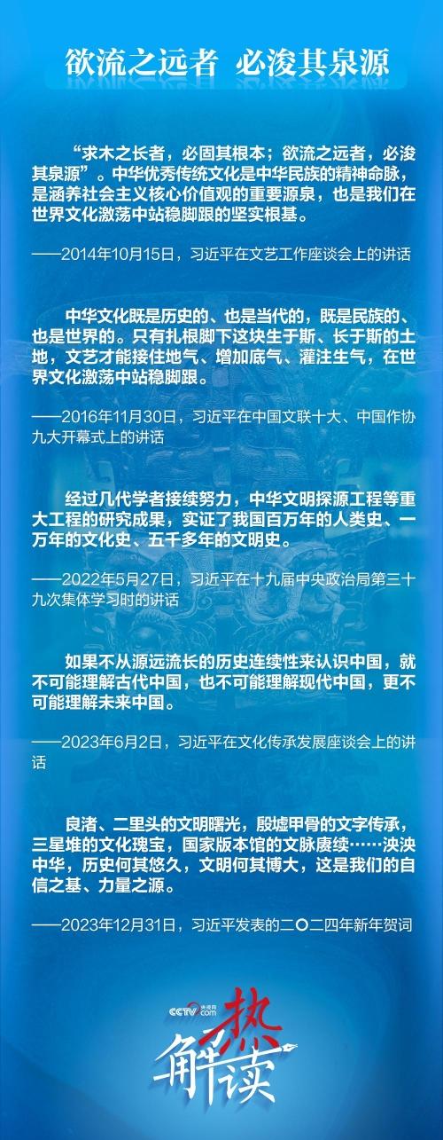 一件件文物、一处处文化古迹、一项项文化艺术,串连起中华民族的文化史,蕴藏着“何以中国”的文化力量。总书记对中华文明之源的关注,彰显的正是他对推动文化繁荣、建设文化强国的深刻思考和文化自信。
