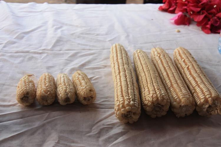 “小技术大丰收”项目开展前后,项目村产出玉米的差异(左为项目前,右为项目后)。