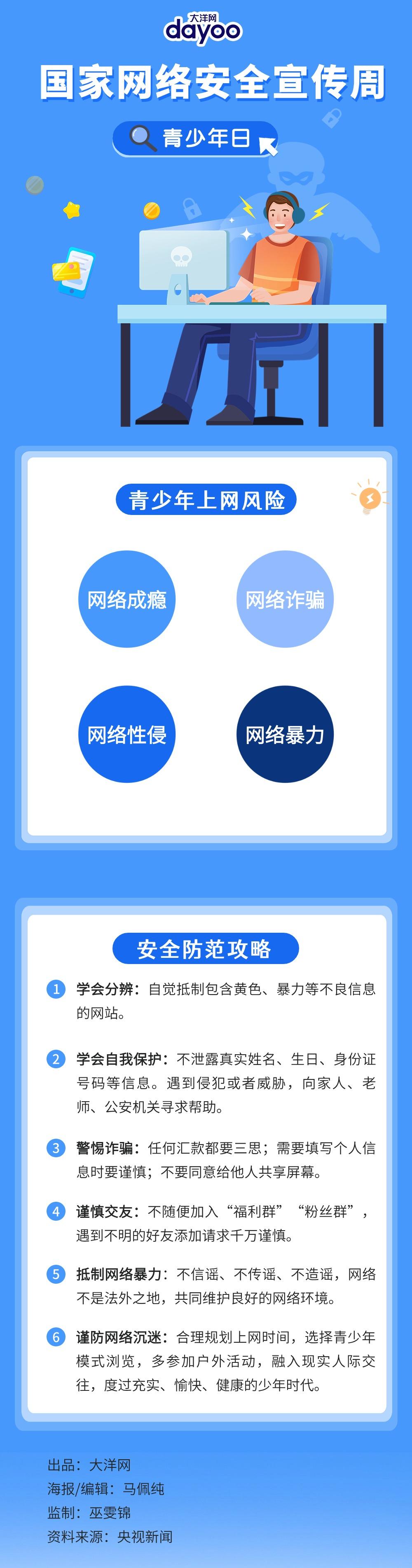9月9日至15日是2024年国家网络安全宣传周。今年的主题是“网络安全为人民,网络安全靠人民”。9月14日是2024年国家网络安全宣传周青少年日。当代青少年是与网络一起成长的一代,网络已经成为越来越多青少年学习生活的必备工具。然而,网络世界新花样五花八门,随之而来的新隐患层出不穷。在日常上网时,青少年群体该注意哪些网络陷阱?如何实现安全健康上网?戳图,一起牢记这些知识点!