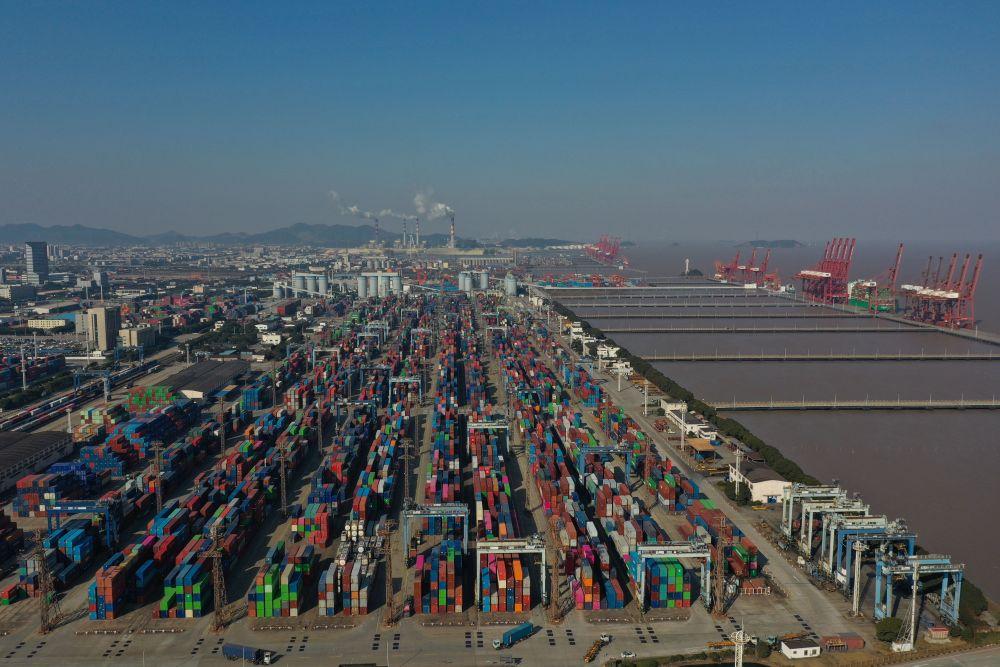 浙江宁波舟山港金塘港区码头作业繁忙(2024年2月11日摄,无人机照片)。新华社发(姚峰 摄)